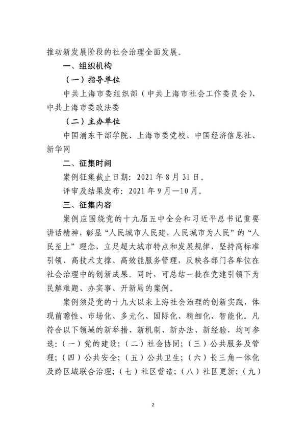 2021年07月12日 17:07:06 来源: 新华财经 7月12日,“第四届中国(上海)社会治理创新实践案例征集”活动正式启动,现面向上海全市范围广泛征集案例。征集日期截止到2021年8月31日,征集结果将于10月底向社会发布。 2021年是“十四五”开局之年。根据“十四五”规划和2035年远景目标纲要,我国将构建基层社会治理新格局,夯实基层社会治理基础,健全社区管理和服务机制,积极引导社会力量参与基层治理。健全党组织领导的自治、法治、德治相结合的城乡基层社会治理体系,完善基层民主协商制度,建设人人有责、人人尽责、人人享有的社会治理共同体。 以人民为中心,围绕实现“一流城市一流治理”目标,上海今年以“数”开篇,通过全面推进城市数字化转型,逐步探索数字驱动社会治理创新的上海经验。近期,正在打“硬仗”的上海提出全面提升城市软实力,充分发挥软实力的“加速器”作用,创造超大城市治理新模式。“软”“硬”并进,让技术更有温度,上海深化了“人民城市”的内涵,再一次明确在社会治理创新中的价值取向。 本届征集活动采取组织报送、专家推荐和自主报名相结合的形式,并将综合专家评审及第三方论证意见,确定最佳案例和优秀案例等。申报案例应坚持问题导向,体现前瞻性、市场化、多元化、国际化、精细化、智能化。此次征集不向参与单位收取任何费用。 活动中发掘的上海社会治理领域的典型案例和最新实践成果,将以案例集等形式进行全媒体展示,并面向全国推广。相关案例还将进入中国浦东干部学院、中共上海市委党校的教学案例库,作为党员干部的第二课堂及现场教学点,部分典型案例将纳入其课程体系和培训教材。 “中国(上海)社会治理创新实践案例征集”活动由中共上海市委组织部(中共上海市社会工作委员会)、中共上海市委政法委指导,中国浦东干部学院、中共上海市委党校、中国经济信息社、新华网等共同发起。征集工作已成功开展三届,发掘出一批符合超大城市实际的社会治理制度创新和先进经验。