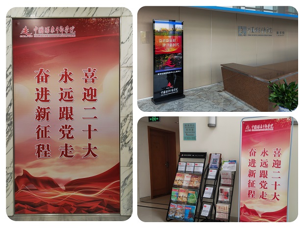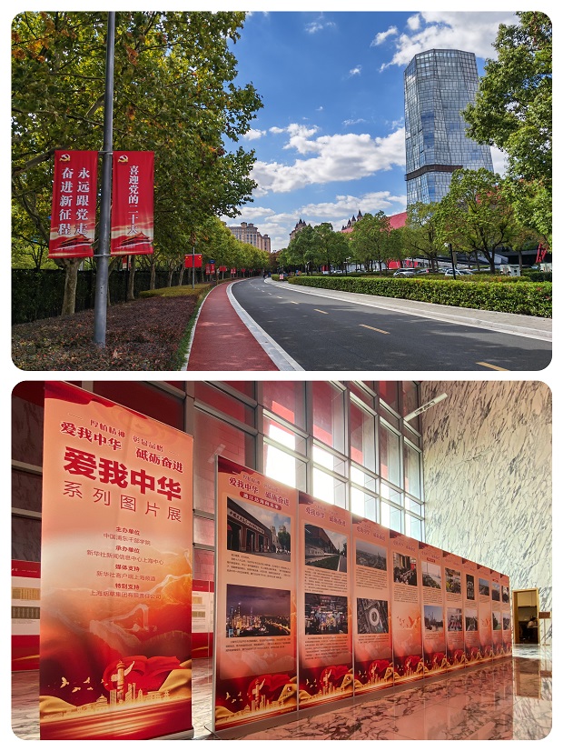 同时,学院利用多媒体屏幕等宣传载体,播放喜迎党的二十大、学习宣传二十大精神主题电子海报;与新华社上海分社合作,举办“通江达海向未来——沿着总书记的足迹之上海篇”图片展;在校园干道、餐饮中心、会议中心等场所做好道旗、海报、合影板等丰富多样的宣传展示。