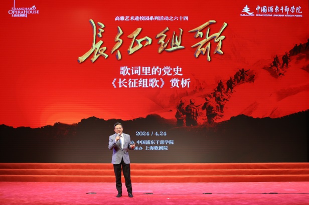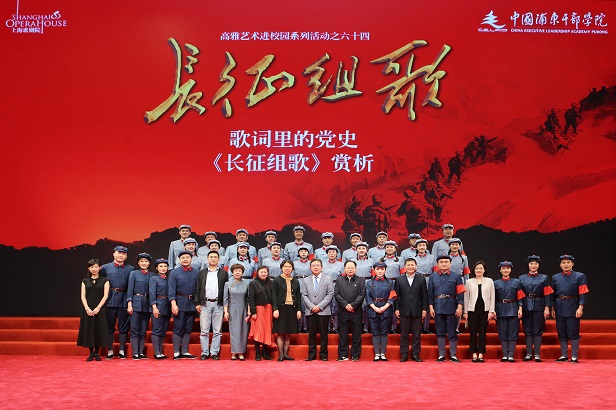 4月24日晚,学院举办第六十四场高雅艺术进校园活动,邀请上海歌剧院演出“歌词里的党史”——《长征组歌》赏析,为在院学员和教职员工带来一场弘扬伟大长征精神的大型声乐作品。学院分管日常工作的副院长、机关党委书记曹文泽,院务委员、机关党委专职副书记宋今,院务委员、培训部主任、机关工会主席肖炳南,上海歌剧院党委书记、常务副院长赵蕾,党委副书记、副院长、《长征组歌》艺术指导张庆新,党委委员、纪委书记王珂等参加活动。