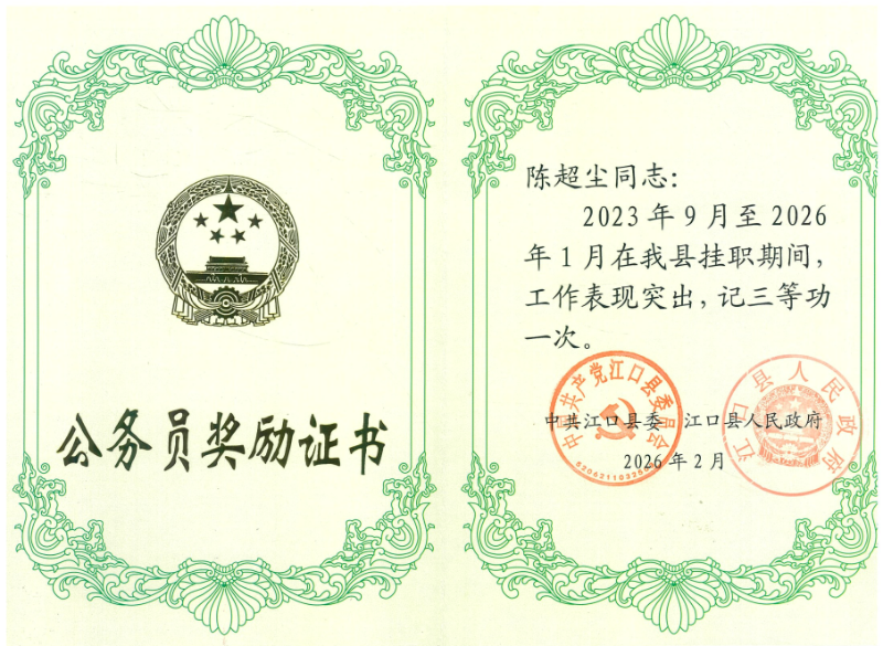 学院第四批定点帮扶工作队赵秀华、陈超尘两位同志挂职期满,因挂职期间工作表现突出,江口县委、县政府给予赵秀华、陈超尘同志分别记三等功一次。